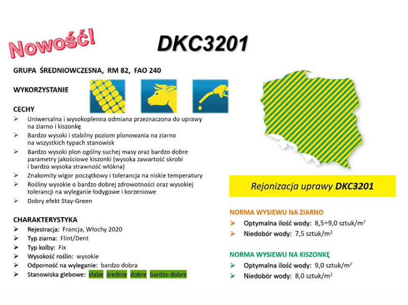 Odmiana DKC 3201 jest uniwersalna. Polecana jest do uprawy zarówno na kiszonkę, jak i na ziarno. Można ją uprawiać w całej Polsce, a doskonały plony daje tam, gdzie kukurydzy klimat nie sprzyja czyli na przykład w północno-wschodniej Polsce.