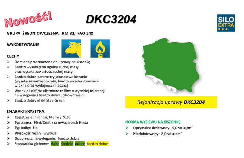Drugą z nowości jest odmiana DKC 3204, przeznaczona już tylko na kiszonkę. Podobnie jak opisywana wcześniej DKC 3201, daje bardzo wysoki plon ogólny charakteryzujący się wysoką zawartością suchej masy. Kiszonka z niej ma bardzo dobre parametry jakościowe, wysoką zawartość skrobi i bardzo wysoką strawność włókna. Kukurydza odmiany DKC 3204 jest bardzo wysoka, z bardzo dobrą odpornością na wyleganie.