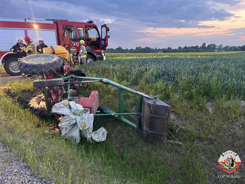 Po dojeździe pierwszego z zastępów druhów OSP zastano przewrócony na bok ciągnik rolniczy.