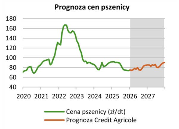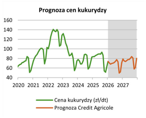 - Uwzględniając czynniki krajowe prognozujemy, że ceny pszenicy i kukurydzy w Polsce wyniosą odpowiednio ok. 85 zł/dt i 70 zł/dt na koniec 2026 r. i ok. 90 zł/dt i 80 zł/dt na koniec 2027 r. - informują analitycy CA. - Głównymi czynnikami ryzyka dla naszej prognozy są warunki agrometeorologiczne wśród kluczowych światowych producentów i eksporterów zbóż, publikacje pierwszych prognoz światowej produkcji zbóż w sezonie 26/27, a także dalszy rozwój sytuacji geopolitycznej, w tym sytuacja na Bliskim Wschodzie oraz jej przełożenie na rynek nawozów.