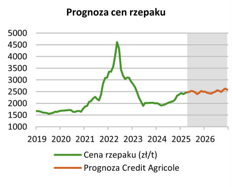 - Uwzględniając czynniki krajowe prognozujemy, że na koniec 2025 r. cena skupu rzepaku wyniesie ok. 2500 zł/t i ok. 2600 zł/t na koniec 2026 r. Głównymi czynnikami ryzyka dla naszej prognozy są warunki agrometeorologiczne wśród kluczowych światowych producentów i eksporterów roślin oleistych, kolejne szacunki światowej produkcji roślin oleistych w sezonie 25/26, a także dalszy rozwój sytuacji geopolitycznej - prognozują analitycy Credit Agricole..