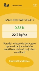 Po wyświetleniu strat ziarna w kombajnie aplikacja Grain Loss Calculator udostępnia odsyłacz do aplikacji New Holland Harvest Excellence, która pomaga operatorowi zoptymalizować ustawienia kombajnu przy uwzględnieniu warunków glebowych i stanu uprawy. Ponadto oferuje ona pomoc przy rozwiązywaniu problemów, umożliwiając operatorowi dalszą optymalizację ustawień kombajnu i prowadząc go przez kolejne kroki procesu.
