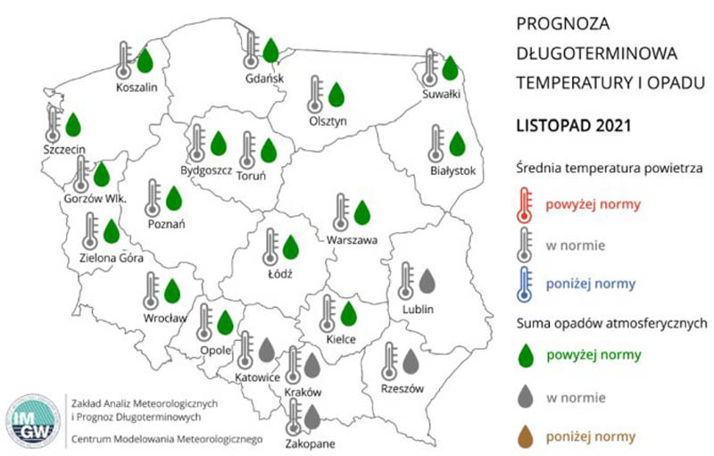 Na obszarze całego kraju średnia miesięczna temperatura powietrza najprawdopodobniej mieścić się będzie w zakresie normy wieloletniej z lat 1991-2020 lub nieznacznie poniżej. Miesięczna suma opadów atmosferycznych w całej Polsce powinna kształtować się w zakresie normy. Na północnych zachodzie możliwa suma poniżej normy.