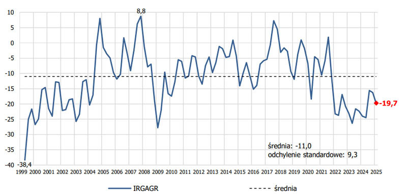 Instytut poinformował, że w I kwartale 2025 r. koniunktura w polskim rolnictwie ponownie się pogorszyła. Wartość wskaźnika koniunktury rolnej IRG SGH (IRGAGR) obniżyła się w porównaniu z IV kwartałem 2024 r. o 3,4 pkt. Pogorszenie się koniunktury rolnej o tej porze roku jest typowe. Tym razem jednak, podobnie jak przed kwartałem, jest słabsze niż zazwyczaj – średnia kwartalna zmiana wartości wskaźnika w pierwszym kwartale roku wynosi bowiem -5,7 pkt. Wartość IRGAGR jest obecnie wyższa niż przed rokiem o 4,3 pkt. Oznacza to, że pomimo sezonowego spadku aktywności rolniczej wciąż umacnia się średniookresowa tendencja wzrostowa, rozwijająca się stopniowo od drugiego kwartału 2023 r.