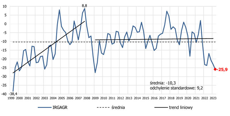 Jak podano, od trzech kwartałów pogłębia się dekoniunktura w polskim rolnictwie. W II kwartale 2023 r. wartość wskaźnika koniunktury rolnej (IRGAGR) obniżyła się – w porównaniu z I kwartałem br. – o 2,8 pkt, do wysokości -25,9 pkt, najniższej, jaką odnotowano w ciągu ostatnich 14 lat. Spadek wartości wskaźnika wynika zarówno z pogorszenia się nastrojów rolników – wartość wskaźnika zaufania, jednej z dwóch składowych wskaźnika IRGAGR zmniejszyła się o 5,2 pkt w ciągu kwartału – jak i zmniejszenia się przychodów gospodarstw rolnych – wartość wskaźnika wyrównanych przychodów, drugiej składowej, obniżyła się o 1,6 pkt.