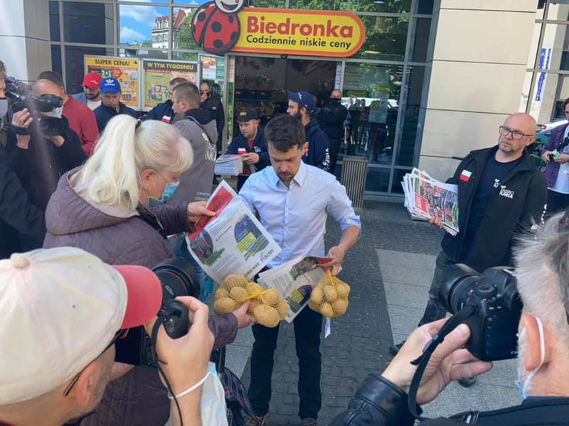 - Korporacje oszukują rolników i konsumentów. Ospale potwierdza to Urząd Ochrony Konkurencji i Konsumentów – nałożył karę na Biedronkę za oszukiwanie dostawców owoców i warzyw 700 mln, ostatnio 60 mln za oszukiwanie konsumentów. To wciąż za mało - mówi Michał Kołodziejczak. - Dziś łączymy miasto i wieś i mówimy jasno: zdrowe jedzenie to nasza wspólna sprawa. Ty też możesz pomóc. Możesz wybierać w sklepie produkty polskie, chodzić na bazary, kupować bezpośrednio od rolników.