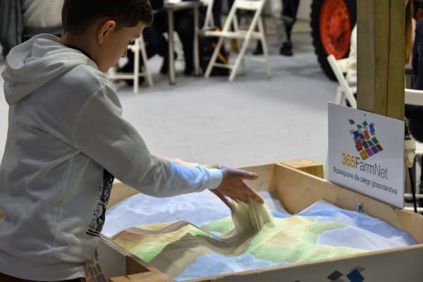 Na stoisku była również interaktywna piaskownica Sandbox – świetna zabawa nie tylko dla dzieci. Jest to swojego rodzaju wirtualna mapa, na której z piasku można usypywać dowolne wzniesienia, tworzyć zagłębienia „terenu” z wodą, a w tym samym czasie mapa ta jest oświetlana odpowiednim kolorem, tworząc efektywne poziomice.