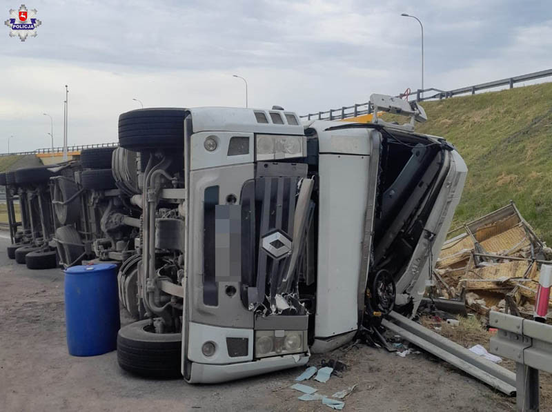 Ze wstępnych ustaleń wynika, że kierujący ciągnikiem siodłowym marki Renault przewożącym żywy drób na węźle Lublin- Rudnik na łuku drogi stracił panowanie nad pojazdem doprowadzając do jego przewrócenia.