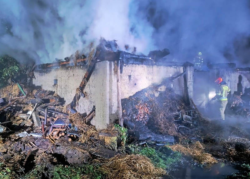 - Po dojeździe na miejsce zdarzenia stwierdzono pożar dwóch budynków gospodarczych, zgromadzonych w nich mienia i inwentarza żywego. Zagrożony drewniany budynek mieszkalny i sąsiedni budynek garażowy z maszynami rolniczymi - poinformował asp.sztab. Krzysztof Waszkiewicz z KP PSP w Augustowie.