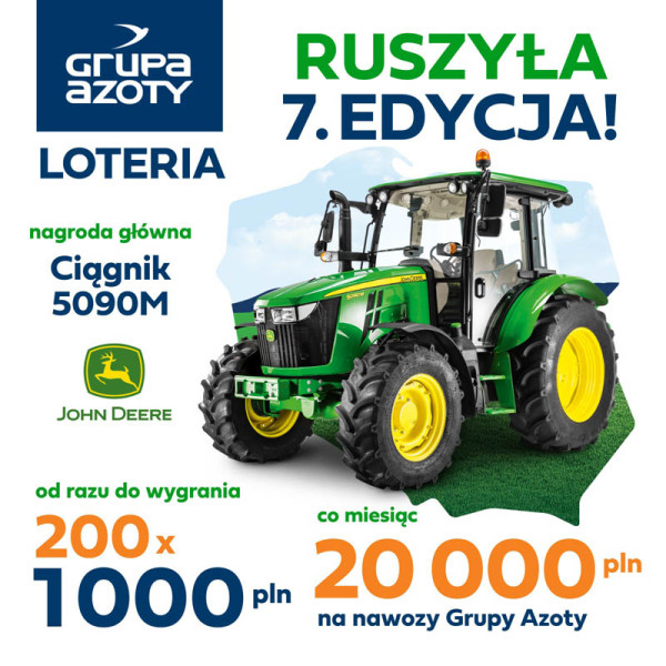 Okres sprzedaży promocyjnej i przyjmowanie zgłoszeń do loterii „Dbamy o polską ziemię” trwa od 1 lutego 2024 r. do 30 kwietnia 2024 roku. Oprócz nagrody głównej, na uczestników loterii czekają: 200 nagród natychmiastowych po 1000 zł w formie przelewu bankowego na konto laureata oraz 3 nagrody miesięczne o wartości 20 000 zł na nawozy Grupy Azoty. Nagrody miesięczne, będą losowane po każdym miesiącu przyjmowania zgłoszeń. W wielkim finale loterii zostanie wylosowany zwycięzca ciągnika John Deere 5090M.