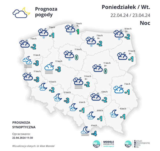 - W nocy na przeważającym obszarze kraju zachmurzenie małe i umiarkowane, jedynie na północy i na południowo-wschodnich krańcach zachmurzenie umiarkowane i duże. W północnej połowie kraju oraz w obszarach podgórskich Karpat początkowo przelotne opady deszczu i deszczu ze śniegiem oraz lokalnie śniegu. Lokalnie mgły ograniczające widzialność do 300 m. Temperatura minimalna od -4°C do -1°C, tylko nad morzem miejscami około 1°C. Wiatr słaby, zmienny, z przewagą zachodniego - informuje Instytut Meteorologii i Gospodarki Wodnej.