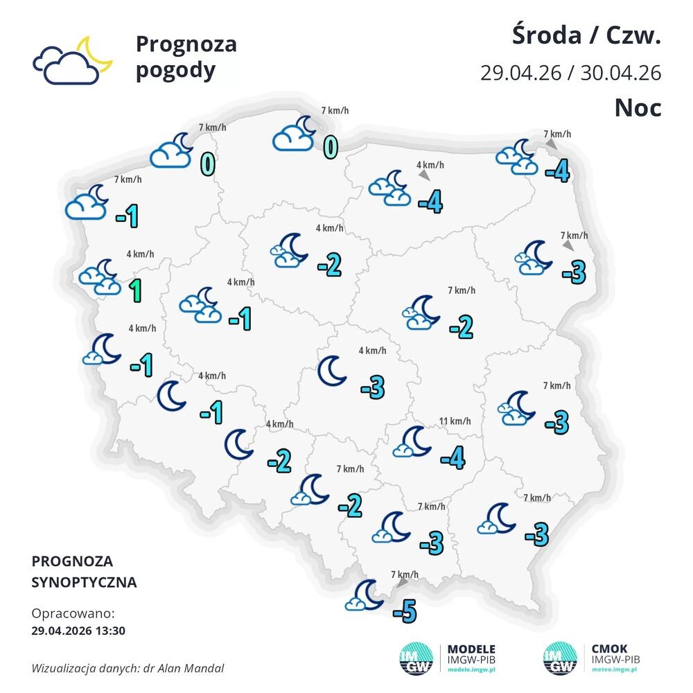 - W nocy zachmurzenie małe, w drugiej połowie nocy na od północy kraju wzrastające do dużego. Temperatura minimalna od około -4°C na północnym wschodzie i na Kaszubach, około -3°C w centrum i na południu, do 1-2°C nad morzem; chłodniej w rejonach podgórskich Karpat około -5°C i lokalnie w dolinach karpackich około -10°C - czytamy w prognozie pogody na najbliższą noc z IMGW.