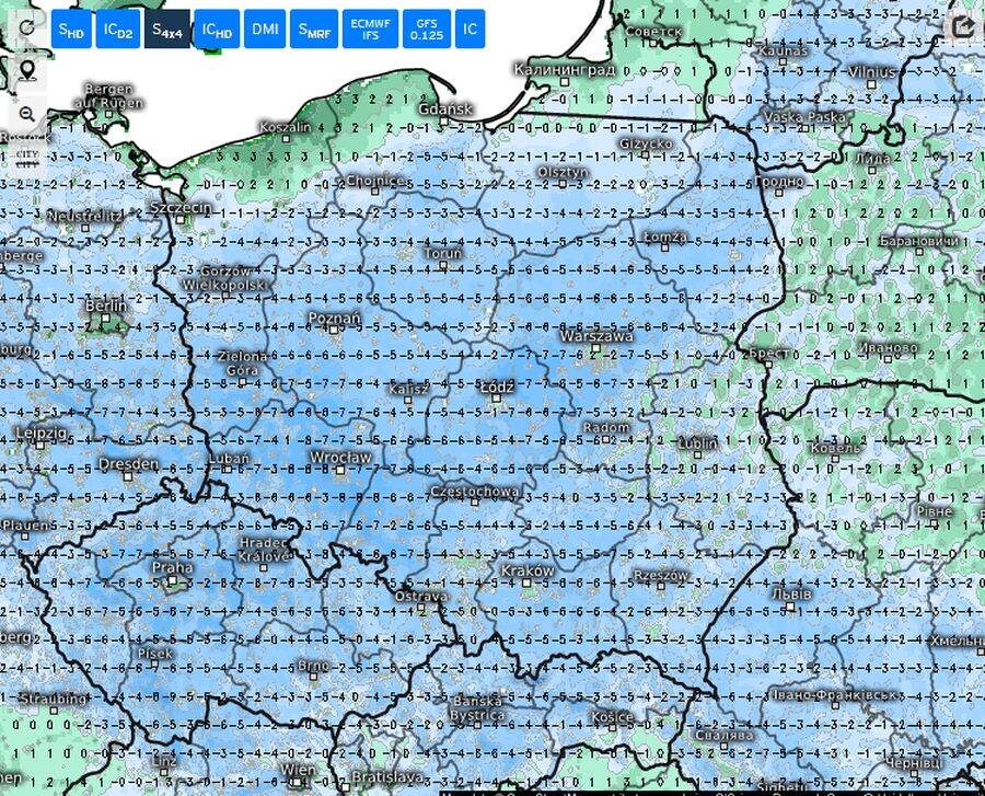 Z wyliczeniami polskich synoptyków zgadzają się międzynarodowe modele meteorologiczne. Swiss 4x4 wskazuje największy mróz w pasie od Podlasia, przez centrum, Wielkopolskę aż do Dolnego Śląska. Najniższe prognozowane temperatury przy gruncie to nawet - 7 do -8 stopni Celsjusza.