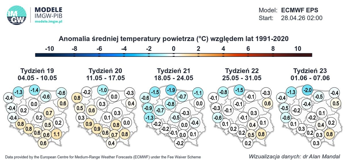 Od czwartku ma się zrobić cieplej, a w niedzielę - nawet upalnie. Warto jednak zauważyć, że wyliczenia IMGW na najbliższe tygodnie nie pokazują upałów - w dużej części Polski prognozowana za to jest ujemna anomalia temperaturowa względem średniej wieloletniej.