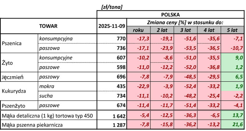 Jęczmień browarniany jest jednym z dwóch liderów spadków w tygodniu 3 -9 listopada 2025 r. Jego cena spadła o 3,1% (26 zł) i za zboże to płacono przeciętnie 841 zł/t. Rok wcześniej zboże to było warte 955 zł/t.
