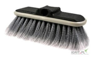Szczotka do kija teleskopowego z hydrozaworem. Włosie szare, delikatnie rozszczepione ułatwia mycie różnych powierzchni – samochody, altany, wysokie okna, tarasy, itp. i nie powoduje zarysowań na m...