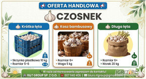 Sprzedam świeży czosnek Egipt. Czosnek jest sortowany, kaliber 6,5+ oraz 7+. Czosnek pakowany jest w worki - kaliber 6,5+ klatki kaliber 6 i kosze kaliber 6,5+ Dostępne ilości paletowe i...