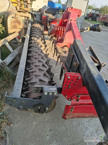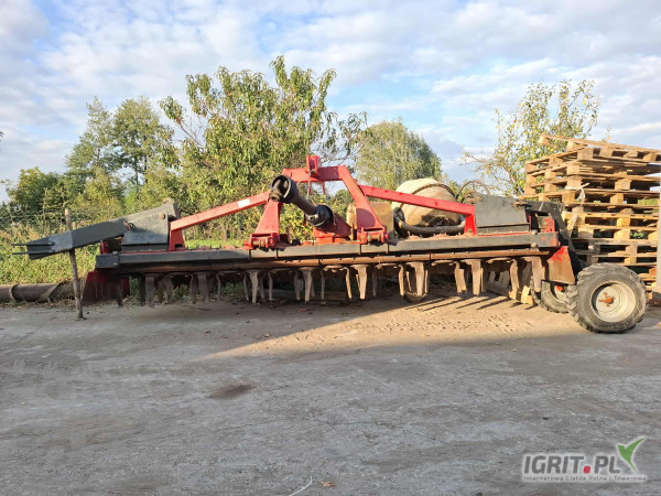 OpisBrona aktywna o szerokości roboczej 4m. Agregat z zaczepem transportowym i wózkiem do przemieszczania się po drogach publicznych. Urządzenie rolnicze służące do spulchniania i wyrównywania gleby. Widoczne na zdjęciu narzędzie jest w bardzo dobrym stanie technicznym, gotowe do pracy na polu.