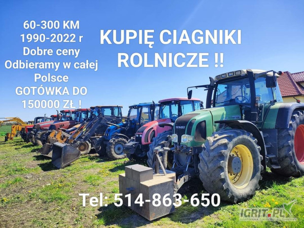 OpisKUPIĘ CIĄGNIKI ROLNICZE- CAŁA POLSKA ! Prowadzimy SKUP CIĄGNIKÓW ROLNICZYCH na terenie całej Polski. Wszystkie marki i modele z lat 1980-2023 do kwoty 150.000 zł. Najwyższe ceny na rynku, szybka sprzedaż - dziś dzwonisz jutro sprzedajesz ! Moc 30-300 KM sprawne ładne w stanie idealnym, bardzo dobrym lub do poprawek wizualnych czy mechanicznych. Jesteśmy legalną firmą działającą na rynku od kilkunastu lat. Kupujemy również maszyny rolnicze typu: rozrzutniki, przyczepy, pługi, sieczkarnie, ładowarki i koparki wszelkiego typu. Wiecej informacji pod nr telefonu 514863650 lub na naszej stronie: www.skupciagnikowrolniczych.pl