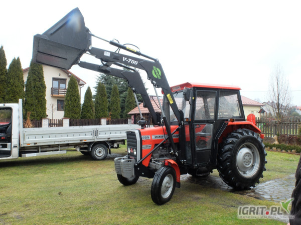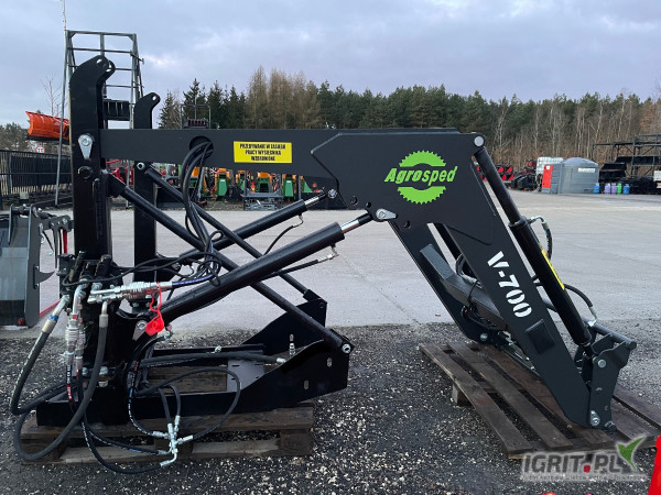 Ładowacz czołowy Agrosped, model V-700 współpracuje z takim osprzętem jak: chwytak, krokodyl, łyżka, łyżko-krokodyl, paleciak, wycinak, które również posiadamy w naszej ofercie.