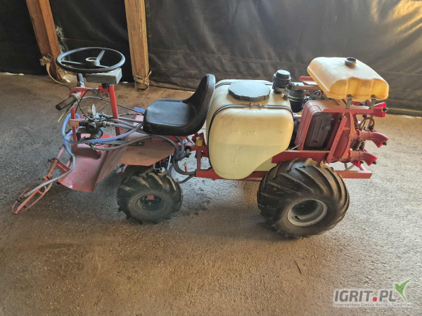 Opryskiwacz spalinowy z 4 biegami, zprzodu posiada belkę herbicydową a z tyłu opryskiwacz kołowy do pryskania krzewów borowki amerykańskiej, winorośli, porzeczki czy malin. Dysze z tyłu i z przodu można ustawić w dowolny sposób zarówno do małych krzewów jak i tych dużych. Ta wersja opryskiwacz to taka mała Ślęza samojezdna.