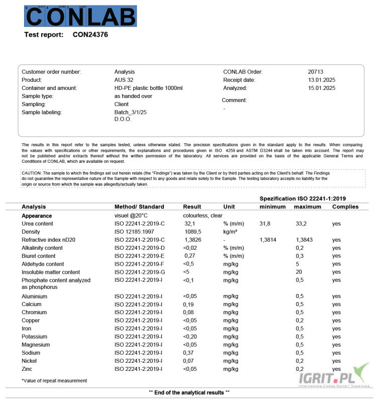 • Skład: 32,5% wysokiej czystości mocznik + 67,5% woda demineralizowana