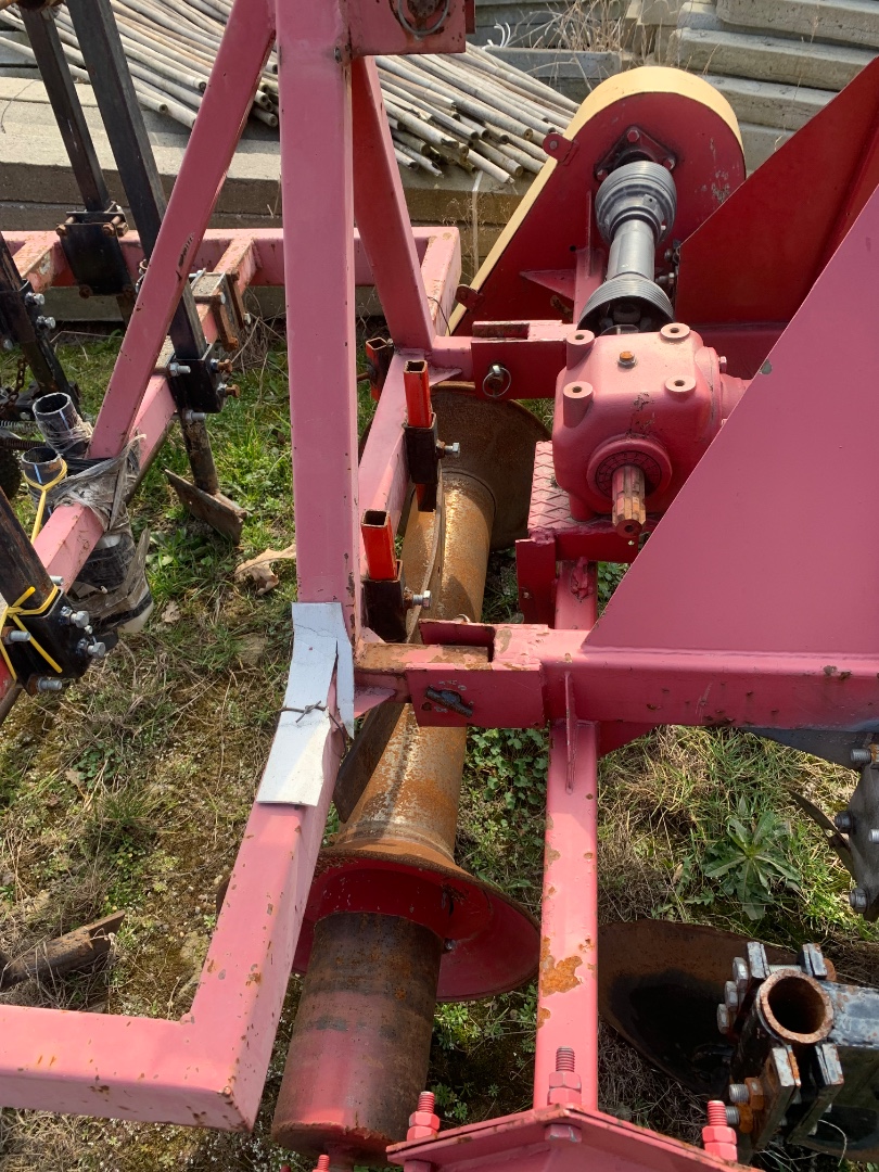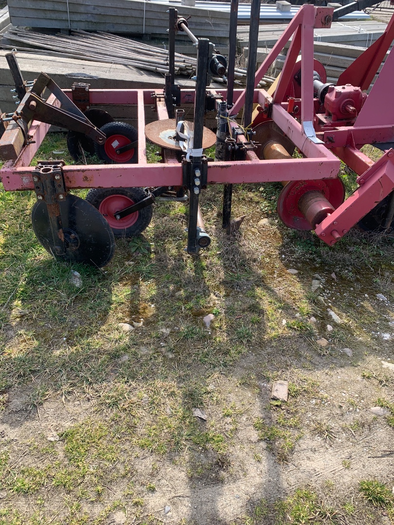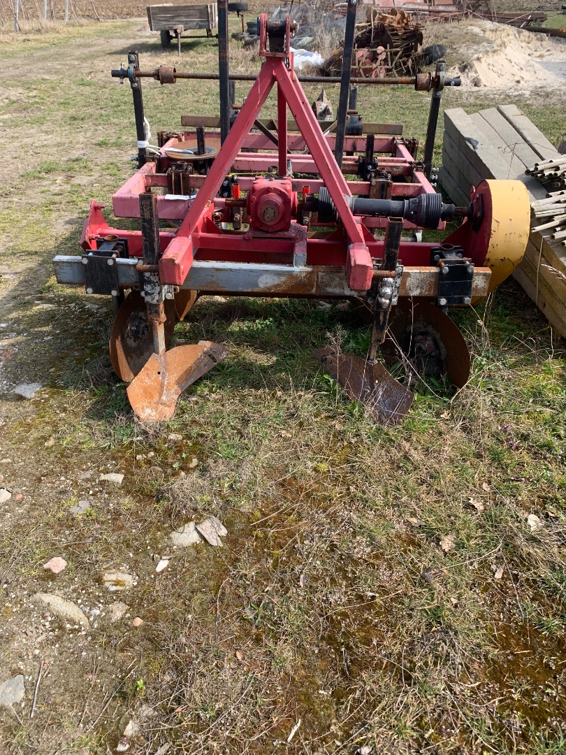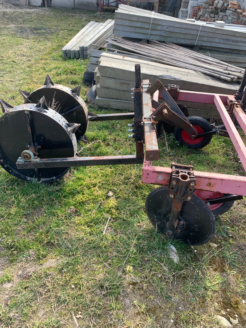 OpisMaszyna do formowania zagonów i rozkładania włókniny lub foli , aktywny wał formujący zagon , znacznik do wyznaczania rozstawy rzędów i odległości roślin odsiewie .