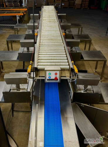 Sprzedam sortownik do owoców. Linia posiada 8 stanowisk do ważenia jest wyposażona w system wag który umożliwia ustawianie zakresu wag sygnalizuje poprawność warzenia kolorem czerwony źle zielo...