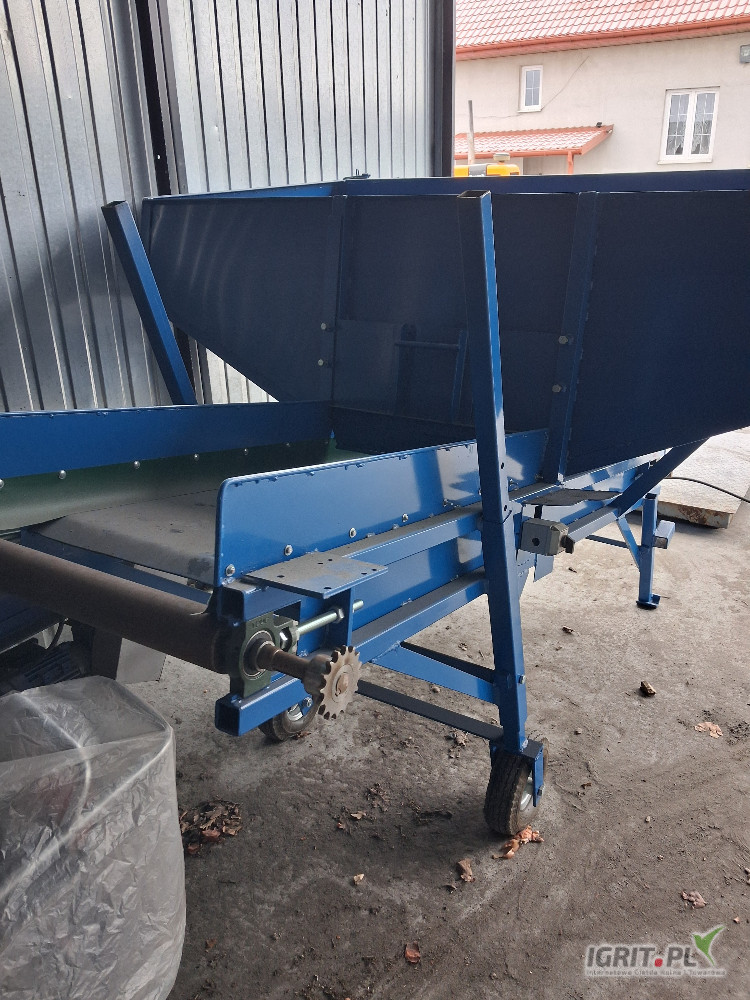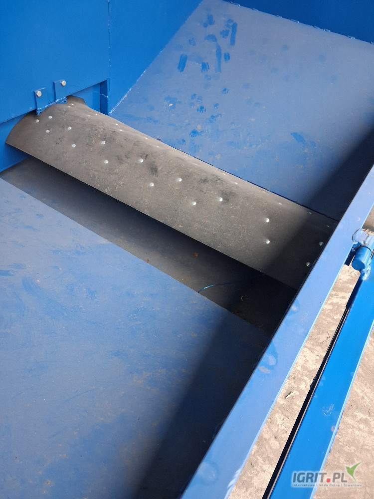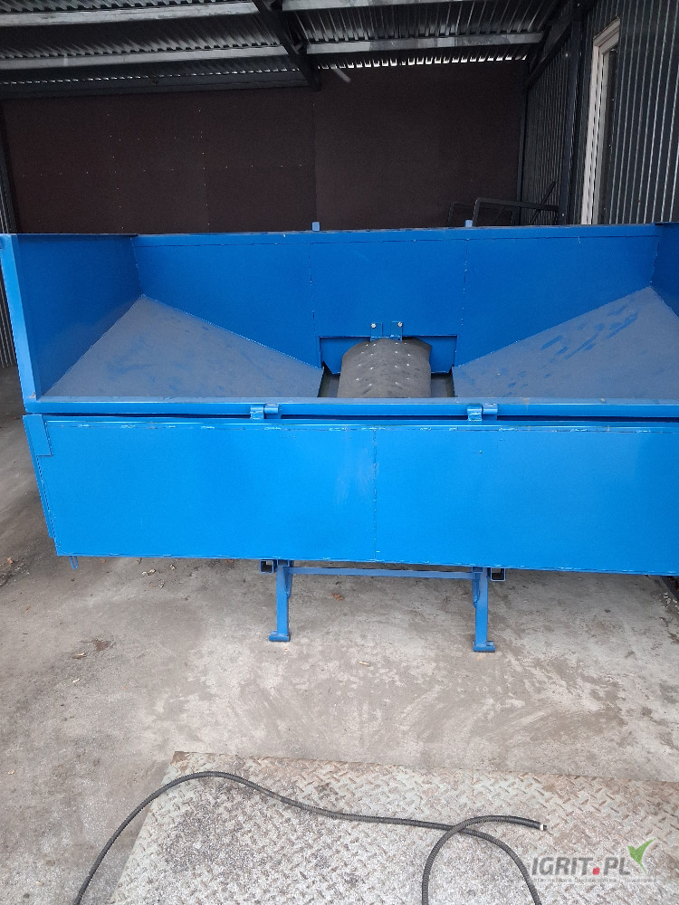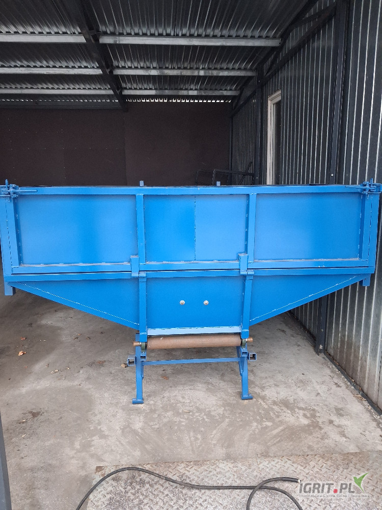 Opissprzedam konstrukcje kosza przyjeciowego tak jak na zdjeciach bez tasmy i silnika robiony dla siebie caly spawany solidny.szerokosc zasypu 215cm dl 110cm wys burt z przodu 90cm. wysokosc zasypu od ziemi 150cm po otworzeniu burty 100cm spokojnie mozna z bigbaka wysypywac.szer tasmy 60cm dlug calkowita podajnika 230cm wysokosc wysypu regulowana od 90cm do okolo 170cm. uchwyty na podpory boczne, regulacja dozowania
