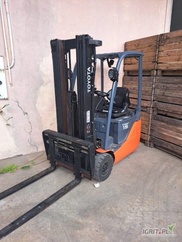 Sprzedam wózek widłowy elektryczny TOYOTA 8FBE15T. Rok produkcji 2016, masz triplex 470 cm, pełne oświetlenie ledowe (kierunkowskazy, stop), wolny skok wideł, pozycjoner i przesów.