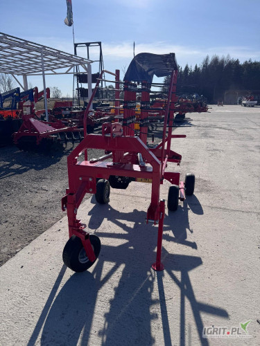 OpisZgrabiarka karuzelowa firmy Metal Technik to maszyna rolnicza służąca do mechanicznego zagrabiania suchej trawy, czyli siana. Zgrabiarka wyposażona jest w dziewięć ramion roboczych, na każdym ramieniu zamontowano 4 podwójne palce sprężyste. W celu ułatwienia transportu osłona i stelaż ochronny są podnoszone nad maszynę, a łatwe do demontażu ramiona zgrabiarki są umieszczane w stojaku na ramie głównej zgrabiarki. Maszyna posiada śrubową regulację wysokości pracy co zapewnia zawsze czyste zgrabianie poprzez dostosowanie wysokości pracy zębów grabiących.