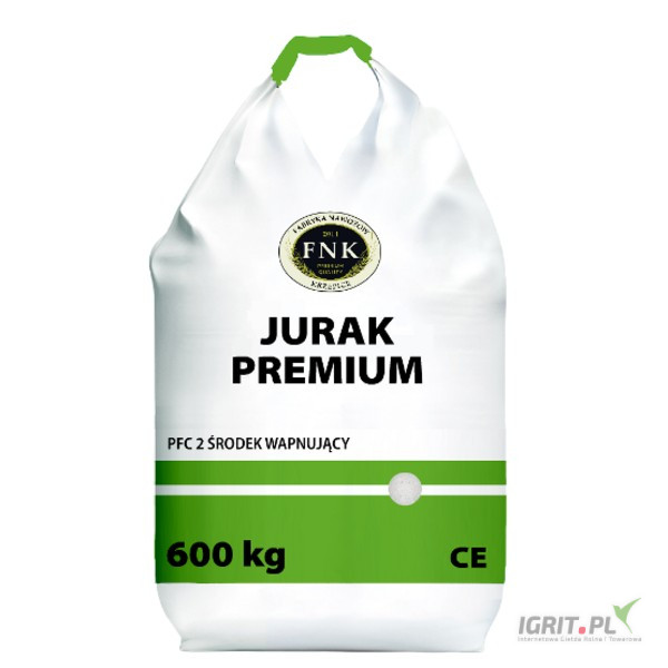 Wapno granulowane bez magnezu Jurak Premium to bezpieczny nawóz wapniowy o wysokiej zawartości CaCO3 - 90% (CaO 50%). Jest on polecany na glebach szczególnie kwaśnych i ubogich w wapń. Dawkowanie powinno być dobierane indywidualnie w zależności od odczynu i składu chemicznego gleby. Granulowana forma nawozu pozwala na bardzo precyzyjny wysiew zaplanowanej dawki, a tym samym prawidłowy rozkład czynnika odkwaszającego. Po zastosowaniu wapna granulowanego Jurak, rozwój roślin przebiega bez zakłóceń, budując wysoki plon. Wapno granulowane Jurak jest wapniowym nawozem węglanowym, wytwarzanym w procesie granulacji uprzednio silnie rozdrobnionej, miękkiej skały wapiennej. Cenną cechą tego nawozu jest możliwość stosowania go wyjątkowo bezpiecznie i czysto – bezpyłowo, co eliminuje częste konflikty występujące przy rozsiewie wapniowych nawozów pylistych. Nawóz ten jest bardzo wygodny nie tylko do zwyczajowego stosowania przedsiewnego, ale także do zastosowania pogłównie, bezpośrednio na powierzchnię pola, bez konieczności mieszania z glebą, np. w uprawach sadowniczych, na użytkach zielonych i polach zbóż ozimych.