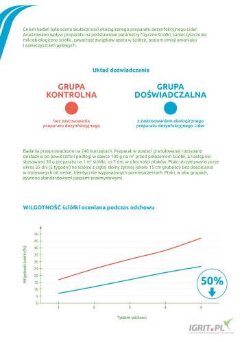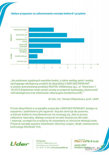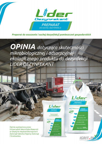Preparat do osuszania i suchej dezynfekcji pomieszczeń gospodarskich. Proces dezynfekcji polega na osuszeniu i podniesieniu pH legowisk i kojców zwierząt do poziomu, w którym bakterie chorobotwórcze nie rozwijają się. Jest to proces całkowicie naturalny, dlatego preparat ten jest bezpieczny dla ludzi i zwierząt, szczególnie przydatny do stosowania w rolnictwie ekologicznym. Preparat posiada wysokie właściwości absorbcji wilgoci, dzięki mikrocząsteczkom węglanu wapna.