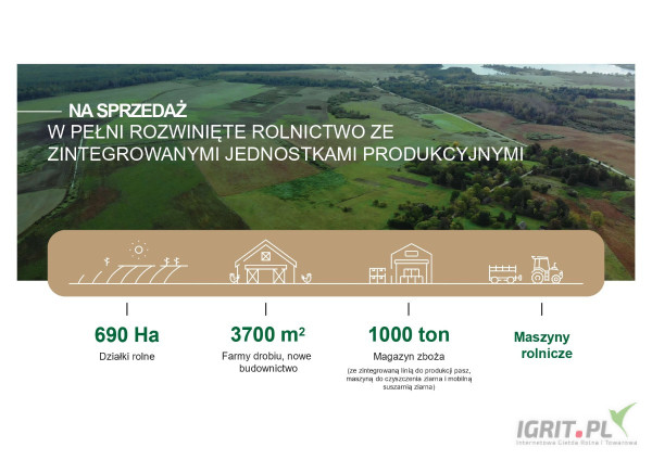 Całość gospodarstwa składa się z 690 hektarów gruntów rolnych z prawem własności