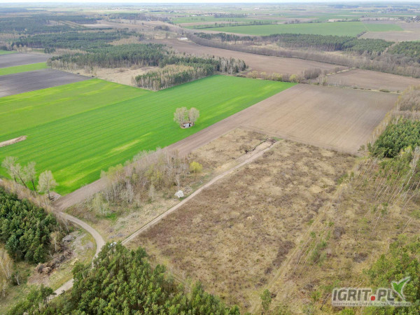 Działka w jednym kawałku, kształt prostokąta o wymiarach szerokość ok. 163 m, długość ok. 440 m.