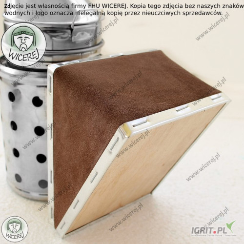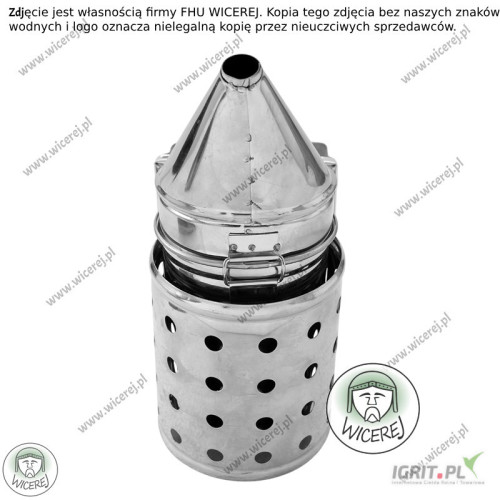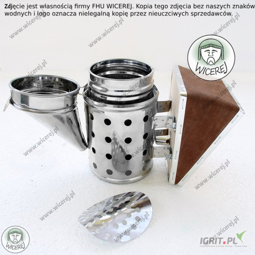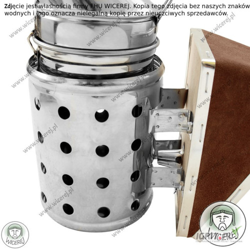 Nasz sklep pszczelarski hurtownia pszczelarska wicerej.pl Nasz sprzęt pszczelarski można zakupić na dotacje Posiadamy w ofercie nowy Nierdzewny Średni Podkurzacz Odymiacz Premium. Obdymiacz, podkurzacz pszczelarski posiada perforowaną chłodnicę – która stanowi osłonę przed poparzeniem. Podkurzacz wykonany jest ze stali nierdzewnej (korpus), natomiast mieszek z grubej skóry naturalnej i sklejki. Odymiacz składa się z korpusu, uchwytu do wieszania oraz Chłodnicy (która chroni przed poparzeniem) oraz wymiennego mieszka ze skóry naturalnej. (istnieje możliwość wymiany miecha). Ten model podkurzacza ze względu na wykonanie ze stali nierdzewnej jest niezwykle wytrzymały i przetrwa wiele sezonów pszczelarskich. Gruba skóra naturalna miecha zapewni długą pracę bez konieczności jego wymiany. Podkurzacz jest niezbędnym narzędziem pszczelarskim i służy do odymiania pszczół. Dzięki dymowi można łatwo uspokoić pszczoły, przed przystąpieniem do prac związanych z ulami lub do miodobrania. Odymiacz jest bardzo przydatny, ponieważ zmniejsza agresję pszczół, co skutkuje łatwym i szybkim wykonaniem prac przy ulach. Wysokość całkowita – 26cm Wysokość mieszka- 15,5cm Szerokość mieszka-11,5cm Wysokość zewnętrzna korpusu bez lejka – 15,5cm Wysokość wewnętrzna korpusu (miejsce do spalania) – 13,5cm Średnica korpusu – 9cm Średnica wylotu dymu – 1,3cm Istnieje możliwość wysyłki na wskazany adres dowolnej ilości Zapraszam do naszego sklepu internetowego wicerej.pl Nasza oferta obejmuje: miodarki, topiarki do wosku, stoły do odsklepiania ramek, odstojniki do miodu, wanienki do odsklepiania, bluzy pszczelarskie, kombinezony, rękawice, kapelusze pszczelarskie, dłuta, podkurzacze, dyfuzory, podkarmiaczki, zasuwki, poławiacze pyłku, widelce do odsklepiania, sita do miodu, kraty odgrodowe i wiele innych. Wysyłka sprzętu na terenie całego kraju. Na każdy zakupiony towar udzielamy gwarancji. Wystawiamy faktury VAT. Nasz sprzęt można zamawiać na dotacje UE ARiMR Zdjęcia zostały wykonane przez firmę FHU WICEREJ, stanowią jej własność, opatrzone są znakami wodnymi oraz logiem firmy. Zdjęcia przedstawiają realny wygląd produktu. Produkty innych sprzedawców z naszymi zdjęciami, na których brak jest naszych znaków wodnych i logo firmy wicerej, oznaczają nielegalną kopię naszych zdjęć przez innych sprzedawców.