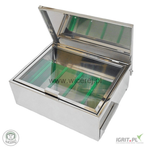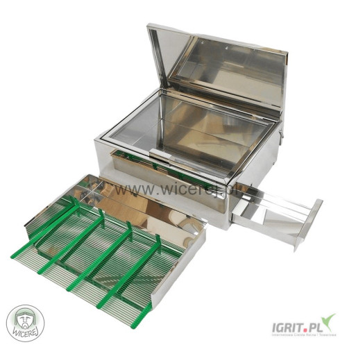 Posiadam w sprzedaży nową topiarkę słoneczną do wosku ze stali nierdzewnej kwasoodpornej AISI 304. W korpusie topiarki na tacy umieszcza się uprzednio wycięte plastry lub w całości z ramką. Pod wpływem działania promieni słonecznych wsad nagrzewa się do temperatury około 120°C co powoduje topienie się woszczyzny. Wosk z tacy, spływa do specjalnej rynienki, a zanieczyszczenia pozostają na podstawie. Dzięki temu uzyskuje się czysty, żółty wosk.