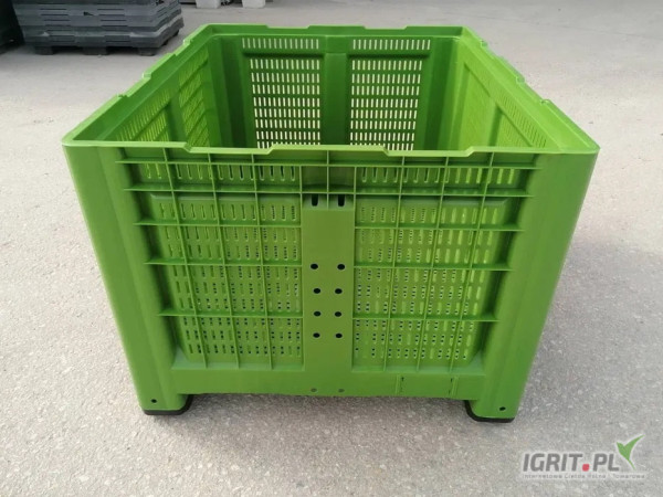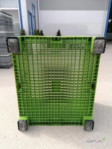 - wzmocnione dno dzięki czemu skrzyniopaleta nie ugina się oraz zmniejsza ryzyko ugniatania jabłek w skrzyniopalecie znajdującej się pod spodem