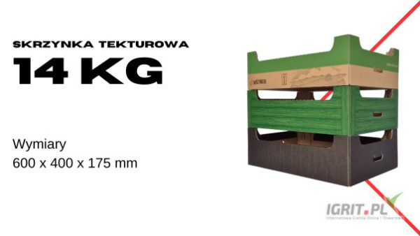 Na Pekinkę/Jabłko - Karton / Skrzynka tekturowa 14kg Wymiary: 600 x 400 x 175 mm Polecamy na: - Jabłka - Kapustę pekińska - Kalafior - Brokuł - Małą białą kapustę - Ziemniaki Różne wersje gramatury: - Ekonomiczna - Standard - Export/Premium Dostępne kolory: - Lidl - Warzywniak (nowy wzór) - Czarny GAJAN-BOX - Producent opakowań na warzywa i owoce Dowozimy zamówienia do klienta Możliwy odbiór własny. Bardzo dobry dojazd z autostrady A2, tylko 5km od węzła "Zgierz/Kutno" Współpracujemy z: - producentami rolnymi, - hurtowniami, - skupami warzyw, - ubojniami Możliwość łączenia różnych opakowań w dostawie Indywidualne projekty opakowań