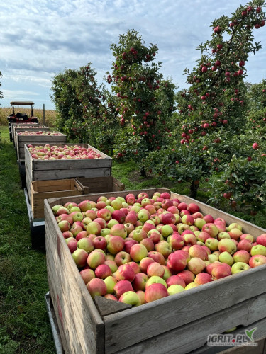 OpisIdared komora KA otwarta 189 skrzyń , 65+ , dobra barwa , lekkie ślady gradu . Cena za wagę w skrzyni . Golden 43 skrzynie 60 + . Jędrność obu odmian ~5,5-6 Możliwe przygotowanie na gotowo.