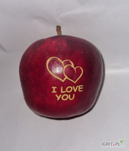 Sprzedam jabłka okolicznościowe grawerowane z walentynkowym motywem.