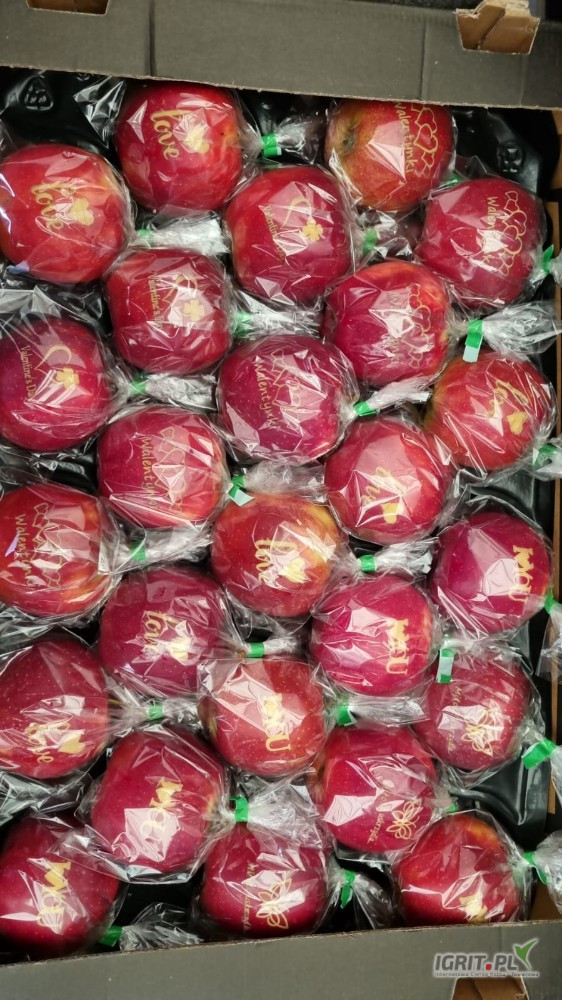 Każde jabłko zapakowane w woreczek celofanowy zaklejony tasiemką. Jabłka ułożone w kartonie na wytłoczce po 25 sztuk.
