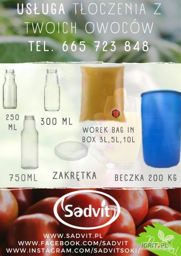 Zapraszamy na usługowe tłoczenie soków z owoców oraz warzyw. Na miejscu posiadamy soki z wiśni, aronii, pomarańczy, czarnej porzeczki i innych owoców, które mogą być dodatkiem do soku jabłkowego. Dost...