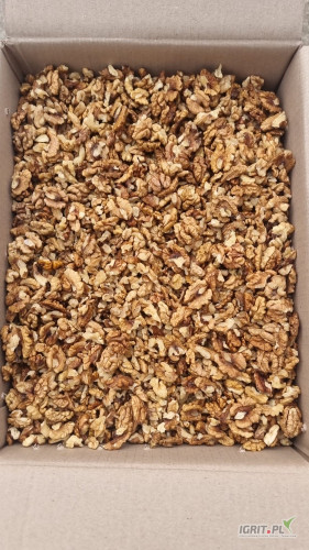OpisSprzedam orzechy włoskie łuskane MIX30%. Wysuszone, przebrane, odwiane od prochu, zapakowane w karton 10kg. Możliwy transport do klienta. Większe ilości
