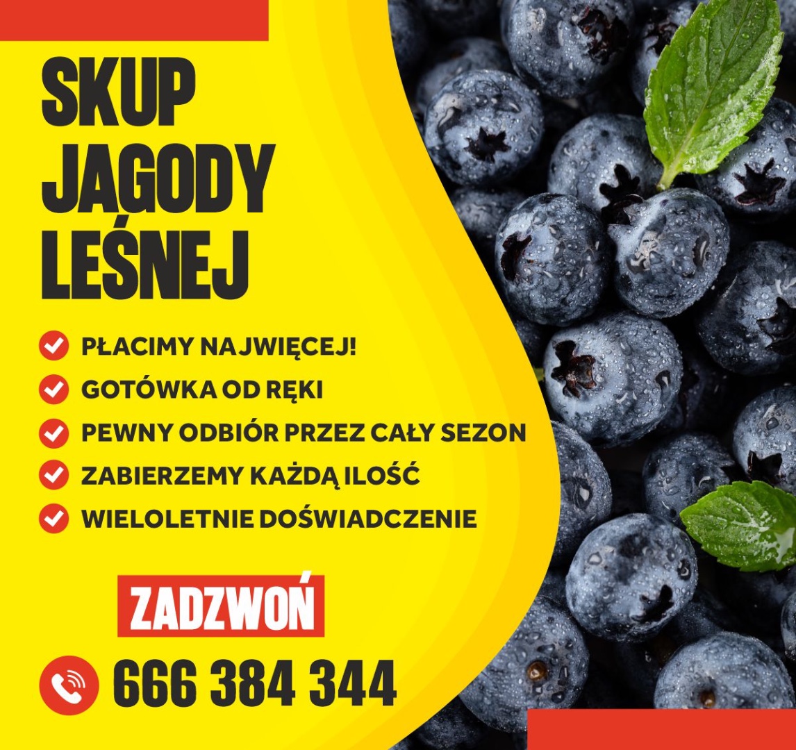 OpisGrupa SAJEWSKI zakupi każdą ilość , Jagody Leśnej Zapewniamy transport z opakowaniem "na pole", gotówka przy załadunku lub szybki przelew. Przy ilościach całosamochodowych odbiór na terenie całego kraju. Ż zapraszamy do kontaktu. Mikołaj Sajewski- 795-782-449 Miłosz Senka 539- 959-578
