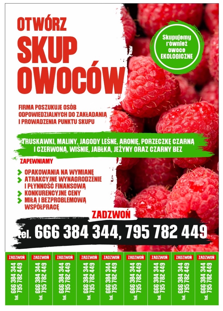 Grupa Sajewski poszukuje osób do otworzenia i prowadzenia skupu owoców W Sezonie 2026r. tj: jagód leśnych, aronii, truskawek, wiśni, maliny, porzeczki czarnej i czerwonej, jabłek, jeżyny. Firma zapewnia opakowanie na wymianę, atrakcyjne wynagrodzenie, konkurencyjne ceny. Płynność finansowa.