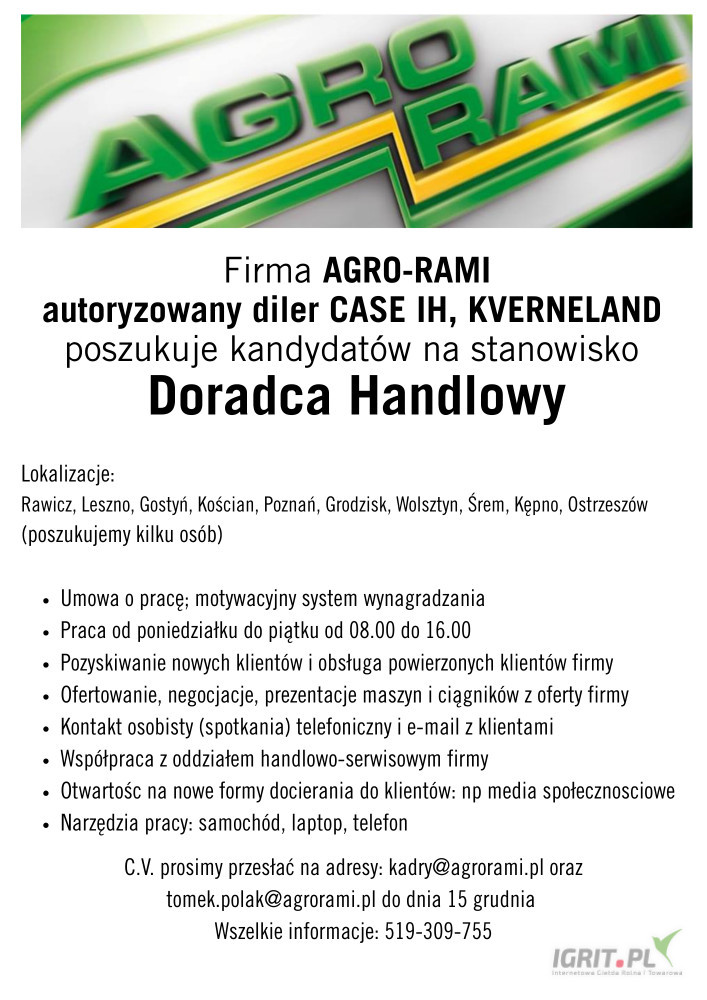 Firma AGRO-RAMI obecna jest na rynku maszyn i ciągników rolniczych od ponad 15 lat. Przez ten czas zdobyliśmy pozycję jednego czołowych dostawców techniki rolniczej w gospodarstwach Wielkopolski i terenów sąsiednich. Nieustannie rozwijamy się, dlatego poszukujemy osoby, które po przeszkoleniu pracować będą jako DORADCA HANDLOWY w powierzonych 3 do 4 powiatach.