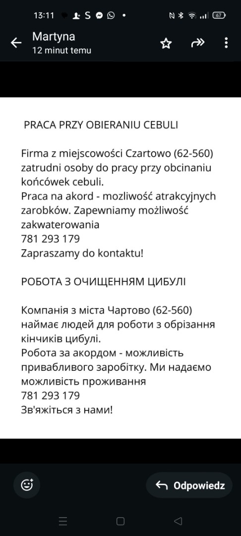 OpisZatrudnię osoby do doczyszczenia i obcinania końcówek cebuli praca w akordzie możliwość zakwaterowania.