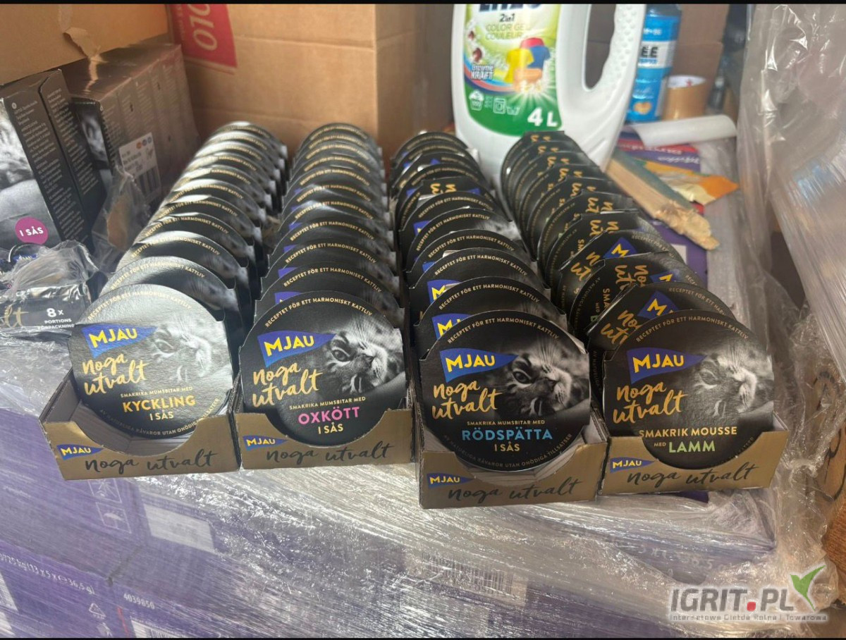 Wyprzedaż - Kot Mjau 85g Każda paleta inny smak. kurczak wołowina ryba Jagnięcina MHD: 03/08/2026/7 1pal= 2970szt (mała paletka) Cena: 1 PLN