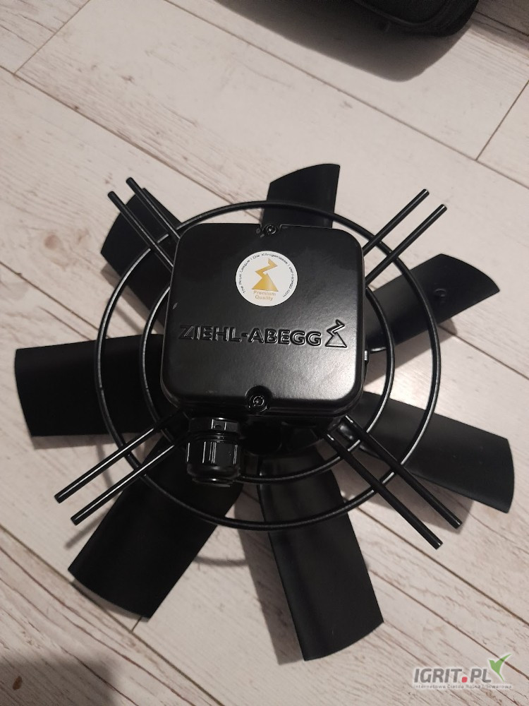 Na sprzedaż Wentylator osiowy Ziehl-Abegg fi 63 cm z silnikiem asynchronicznym 0,52 kW, przeznaczony do montażu w kominach wentylacyjnych budynków inwentarskich. Prezentowany wentylator kominowy Ziehl-Abegg z serii FF posiada pięć wyprofilowanych sierpowo łopat z blachy aluminiowej, które zapewniają wymianę powietrza na poziomie 12 100 m3/h przy 0 Pa. Warto zwrócić także na wyjątkową cichobieżność wentylatorów z tej serii.